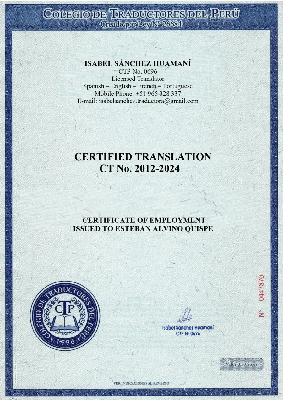 Nota: La TCD cuenta con la legalización de la decana del Colegio de Traductores del Perú, lo permite presentarla directamente ante el Ministerio de Relaciones Exteriores para su legalización o apostilla.